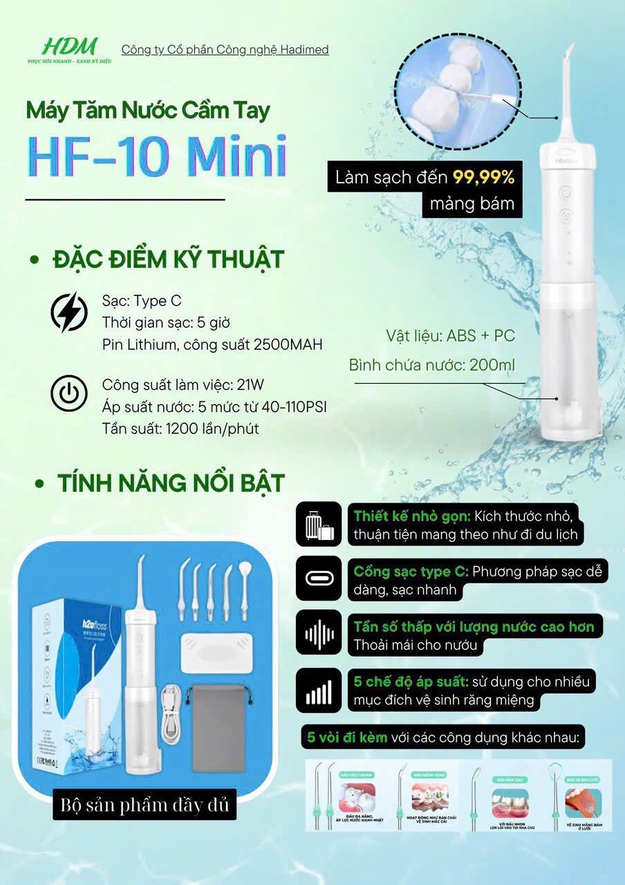 Máy tăm nước HF-10 Mini (còn gọi là HF-10mini) là thiết bị chăm sóc răng miệng công nghệ cao, kết hợp áp lực nước để làm sạch mảng bám và thức ăn dư thừa tại vùng kẽ răng, nướu, vùng quanh răng khôn hoặc vùng khó tiếp cận.