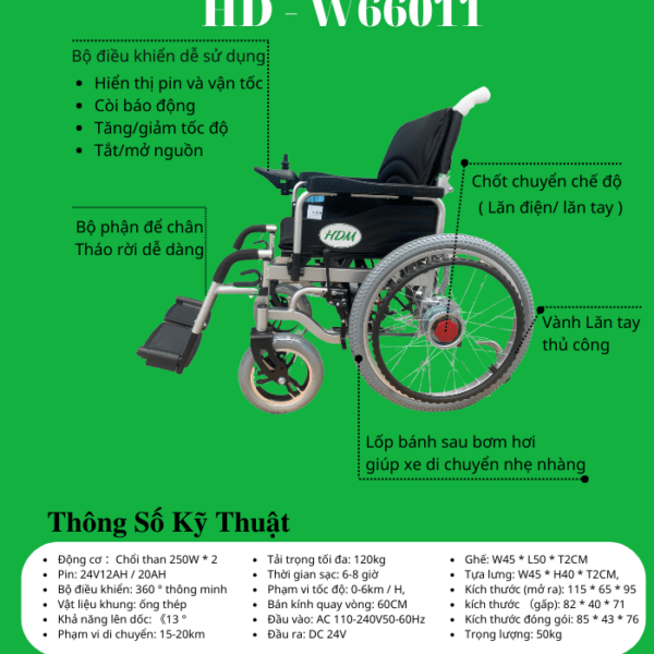 Xe Lăn Điện Tiêu chuẩn HDM HD – W66011 Đây là chiếc xe lăn điện cực HOT của năm, với thiết kế độc đáo: vành nan hoa bánh tăm kích thước lớn, có vành lăn tay. Bên cạnh đó chiếc xe cũng vô cùng chắc chắn bền đẹp, tạo cảm giác rất an toàn cho người mua cũng như của người sử dụng. HD – W66011 phù hợp di chuyển trong mọi địa hình đường xá tại Việt Nam mà không lo hỏng, xóc, hay sang vành.